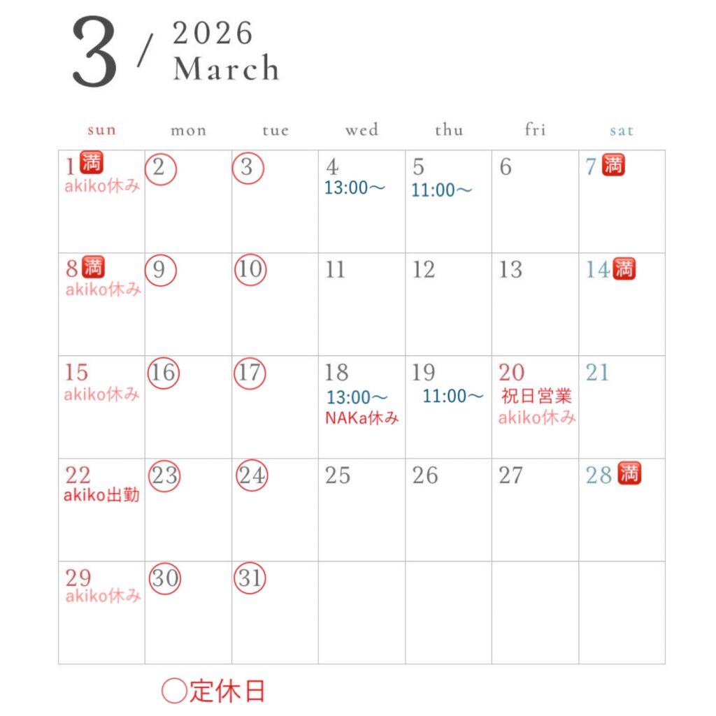 3/18(水)NAKa休み,akiko予約可能